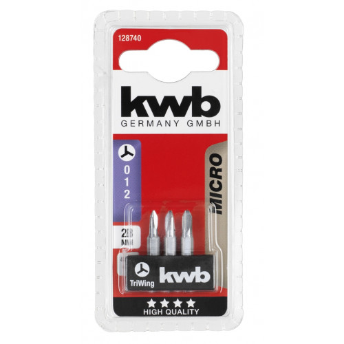 kwb MICRO bits, 28 mm, 3-delig -- MICRO bits met TriWing-punt, 3-delige set. Bits speciaal ontwikkeld voor toepassingen met uiterst kleine schroefverbindingen. O.a. in de consumentenelektronica en bij gameconsoles. Hoogwaardig TQ60-staal. Extra lange 28mm-bits, om moeilijk toegankelijke schroeven te bereiken. Met 4mm-zeskantschacht. Oppervlak in satijnfinish. Bits op praktische bevestigingsstrip.